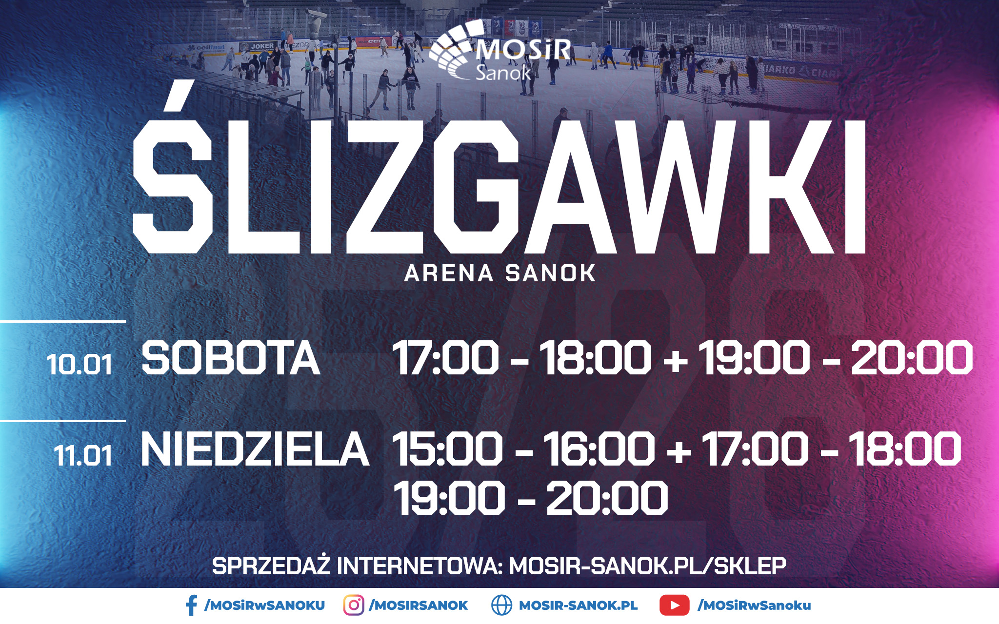 W celu uniknięcia kolejek przypominamy, że kasy biletowe i wypożyczalnie otwieramy na około godzinę przed ślizgawką, dodatkowo istnieje możliwość zakupu biletu online na stronie: https://mosir-sanok.pl/sklep