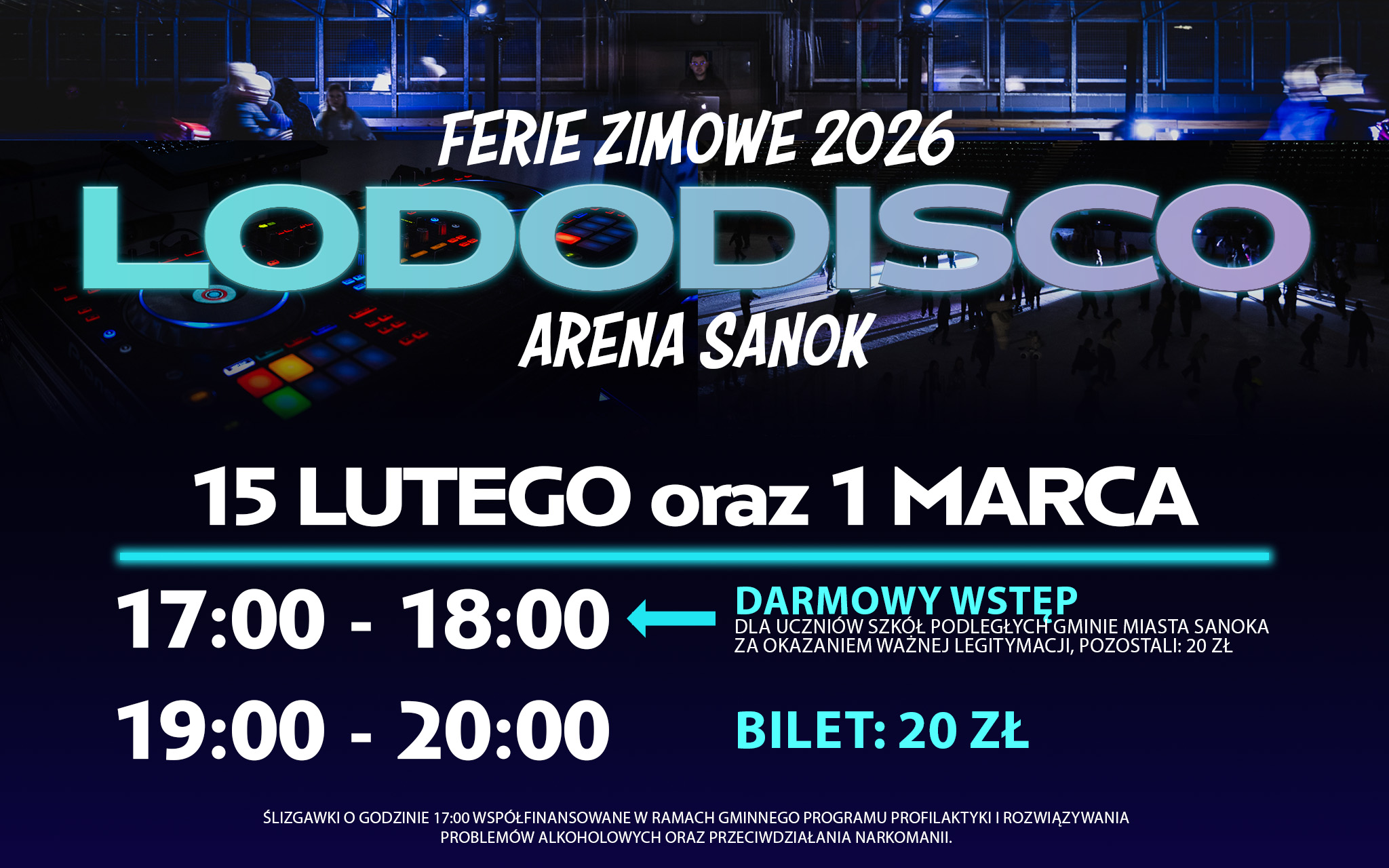 Pierwsza dyskotekowa ślizgawka (17:00) jest darmowa dla uczniów szkół podległych Gminie Miasta Sanoka – za okazaniem ważnej legitymacji szkolnej ![]()